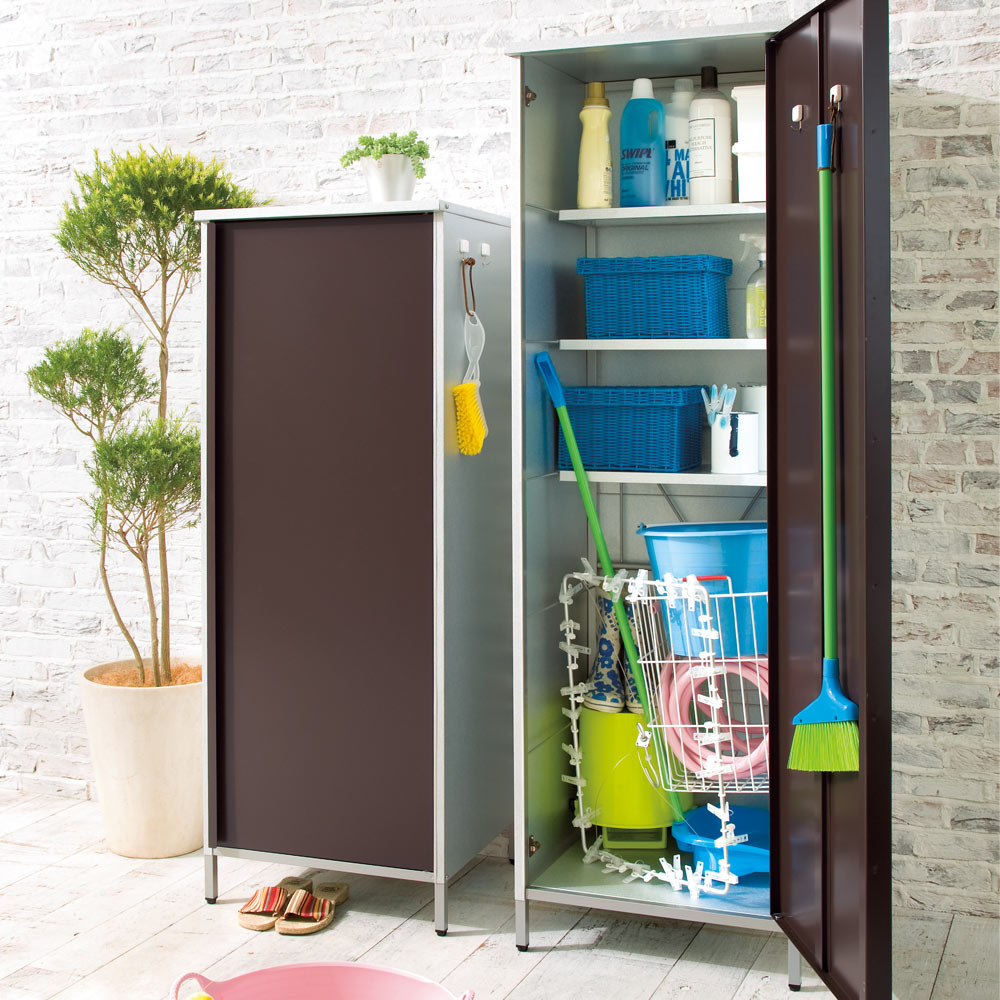 ◎外壁にマッチするモダンなデザインのガーデニング物置◎・丈夫なガルバリウム鋼板を使用。・ベランダにもおすすめのスリムなデザイン。◎おうちの外観に素敵に溶け込むロッカー◎・家の外に置く物置は、意外とお隣から見えるものです。ここはひとつこだわりの品を。・お庭からベランダまで素敵に溶け込むロッカーです。モダンデザインの物置で、ゆとりの収納プランを。・物置の扉はダークブラウンとホワイトの2色をご用意。お庭のテイストに合わせてお選びください。◎収納力もしっかり◎・ポリタンクも収納できる、頼れる収納力も自慢です。・棚