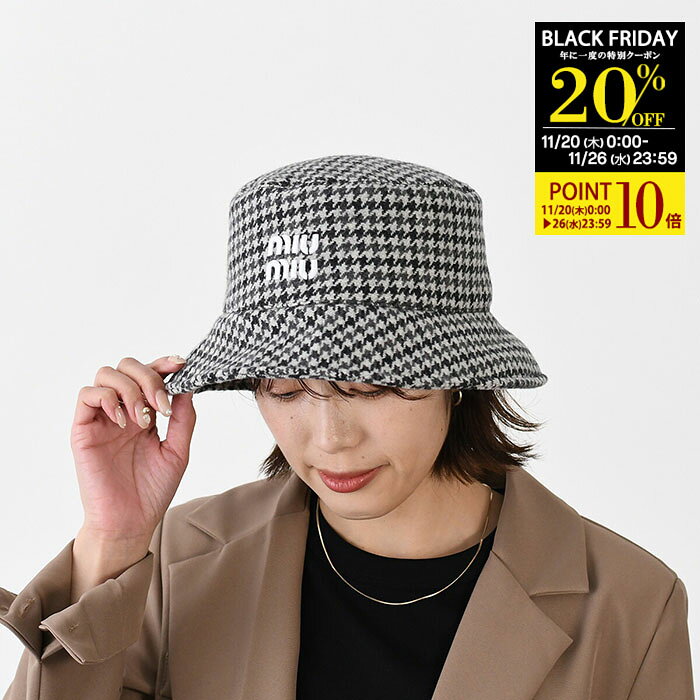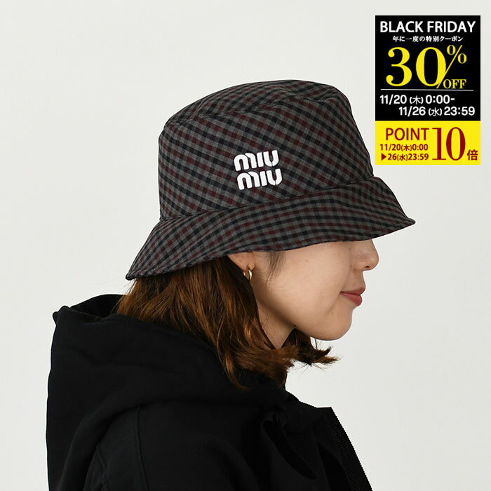 2.【20%OFFクーポン&P10倍】MIU MIU ミュウ ミュウ バケットハット 帽子 バケハ フロントロゴバケットハット 5HC196 2F87 レディース グレー ブラック ロゴ ウール 格子柄