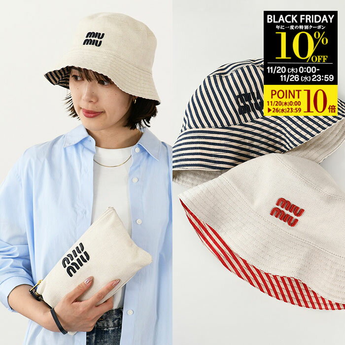 18.【10%OFFクーポン&P10倍】MIU MIU ミュウミュウ 帽子 ストライプリネンブレンド バケットハット 5RM030 2CQQ レディース ネイビー レッド ストライプ リバーシブル バケハ ポーチ 収納 ロゴ 春夏
