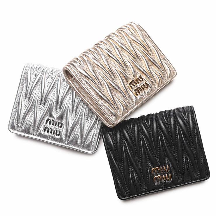 MIUMIUは、イタリアの高級ファッションブランドで、プラダの妹ブランドとして1993年に創業されました。コンパクトなシルエットに、卓越したクラフトマンシップが宿るマテラッセの洗練された極上の質感と立体感が際立つ、スモールサイズのナッパレザー(羊革)の2つ折り財布。磨き抜かれた職人技の中に、様々なメタルで仕上げられたパーツと同色の魅力的なメタルのMIU MIU ロゴが、一目でミュウミュウとわかるアイコニックな存在感と輝きを放ちます。COLORSWhich color are you going to ch