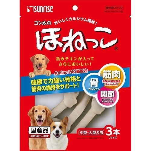 お店TOP>ペット用品>犬用品>犬のおやつ・サプリメント>犬のその他おやつ>サンライズ ゴン太のほねっこ Lサイズ 中型・大型犬用 (3本入)★税込5400円以上で送料無料★【サンライズ ゴン太のほねっこ Lサイズ 中型・大型犬用の商品詳細】●コツコツ食べて、健康で力強い骨格と筋肉の維持をサポート!●「Amino L40」新配合により、筋肉のもとになる栄養素アミノ酸の補給に役立ちます。●中型・大型犬にぴったりのLサイズ。【サンライズ ゴン太のほねっこ Lサイズ 中型・大型犬用の原材料】穀類(小麦粉等)、肉