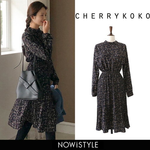 2.CHERRYKOKO(チェリーココ)swerve, ops【10/4up_mo】韓国 韓国ファッション 花柄ワンピース プリーツスカート ワンピース 花柄 シフォンワンピース 秋 長袖ワンピース ボトルネック レディース ファッション【5】