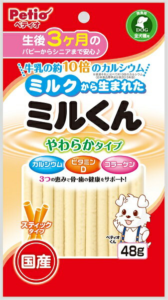 カルシウム・ビタミンD・コラーゲン、3つの恵みで骨・歯の健康をサポート! ●牛乳の約10倍のカルシウム(日本食品標準成分表2015年版)を配合しているので、おいしくカルシウムを補給できます。 ●濃縮ミルクを練りこんでおいしさプラス! ●ちぎって与えやすいスティックタイプ! ●対象年齢:生後3ヶ月〜 ※製造工程上、くぼみが見られる場合や、形状・サイズ・硬さなどに多少のバラツキがあります。