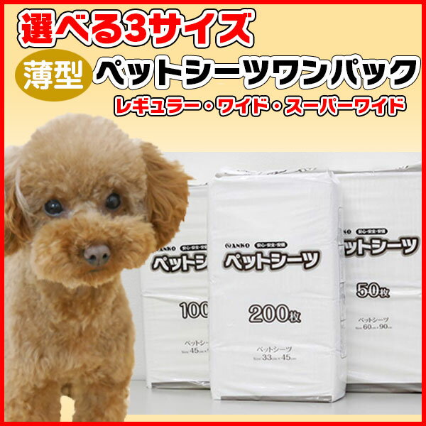 商品説明シーツサイズ うす型ペットシーツ選べるワンパックレギュラー200枚1枚のサイズ:縦33cm×横45cmワイド100枚 1枚のサイズ:縦45cm×横60cmスーパーワイド50枚1枚のサイズ:縦60cm×横90cm原材料紙・パルプ、ポリマー商品説明 ・素早く大量のオシッコの吸収ができる。・モレをしっかり安心ガードさらさらのスピード吸収力。 ・高吸収力なのにコンパクトな薄さ、収納便利でゴミも少ない。 ・白いシーツで見た目は清潔で交換タイミングがすぐわかる。毎日の健康チェックもできる。 製造国
