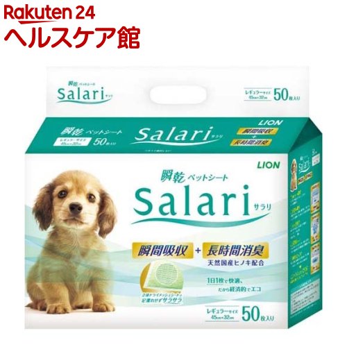 お店TOP>ペット用品>トイレタリー・衛生用品>犬用トイレ用品(トイレタリー)>レギュラーサイズ(犬用シーツ)>瞬乾ペットシート SaLari(サラリ) レギュラーサイズ (50枚)★税抜3500円以上で送料無料(沖縄除く)★【瞬乾ペットシート SaLari(サラリ) レギュラーサイズの商品詳細】●安心の吸収力と驚きの消臭力で1日1枚、経済的でエコな犬用トイレシートです。●2段構造立体ドライメッシュシートが、オシッコの逆戻りによる足ヌレを解消、フチモレもせず。●シートの表面はいつもサラサラ。●さらに天然国