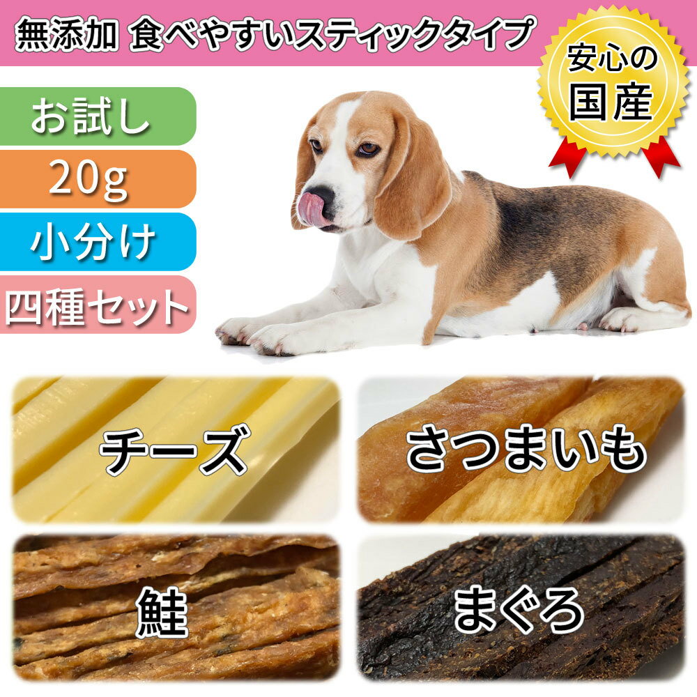 5.マラソン限定 ポイント10倍 犬 おやつ スティック 無添加 国産 お試し 小分け ギフト セット 詰め合わせ 個別包装 4種 各20g まぐろ さつまいも 鮭 チーズ 食つき ご褒美 ご馳走 ドッグフード 犬食 プレミアムドッグフード