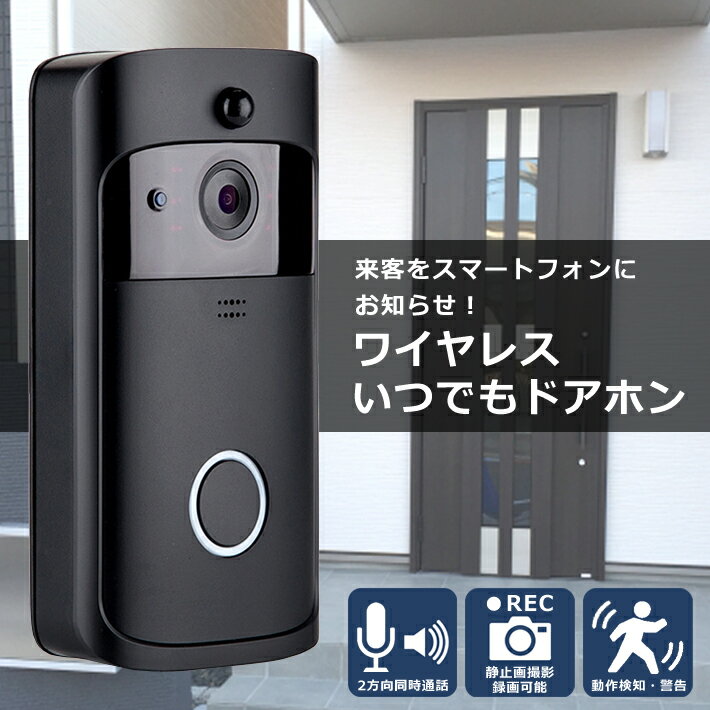 spec ●専用アプリをスマートフォンにインストールすることで、ドアホンからの呼び出しがスマートフォンにプッシュ通知され、そのまま会話可能! ●静止画撮影や、録画も可能! ●動作感知センサーが付いており、人が通ったら起動し記録保存されます。 ●夜間赤外線センサーも付いているので、ガレージなどの防犯にもピッタリです。 ※ご家庭にネット環境及びWi-Fiルーターが必要となります。 また、専用アプリのインストールが必須となります。 ■解像度:960P ■レンズ:1.7mm ■視野角:166度 ■Wi-Fi方式: