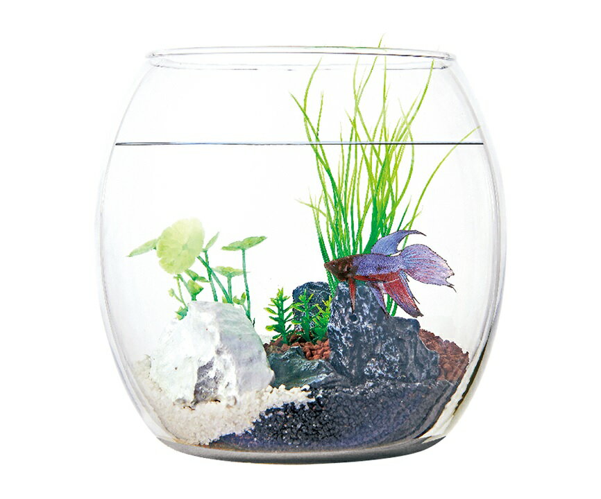 テーブルサイズの小さなアクアリウム テーブルにちいさな癒しスターターセット 水槽サイズ…約W173×D173×H165mm 水容量…約2.6L 適応魚種…メダカ、アカヒレ等の小型魚(4匹まで)・小型金魚(2匹まで) セット内容…水槽本体、サンド、オーナメント、浄水貼るだけプレートミニ