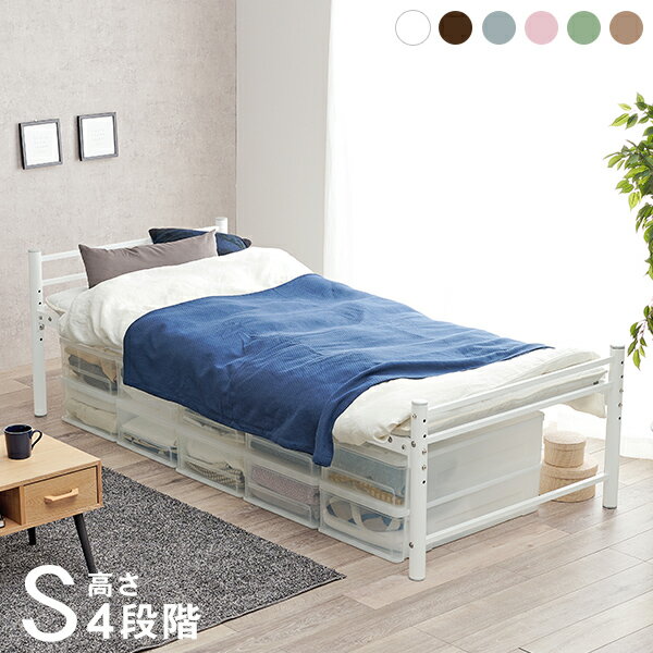 お買い物ガイド 高さ3段階調整が出来るパイプミドルベッド!【ベッドフレーム単品】 ■ベッド床下の高さを(40・45・50)cmに調節が可能。 ■床下50cmだと収納ボックスが10個も収納 (使用収納ボックスサイズ:幅39×奥行74×高さ18cm) ■大きなキャリーケース・高さのある家電など色々と収納可能 ■汗や湿気を逃がす通気性抜群のメッシュ床 ■通常のシングル敷き布団や敷きパッドがそのまま入る寝床長さ(約)210cm 【商品サイズ(約)】 本体:幅100×奥行220×高さ80cm 床下サイズ:40・45