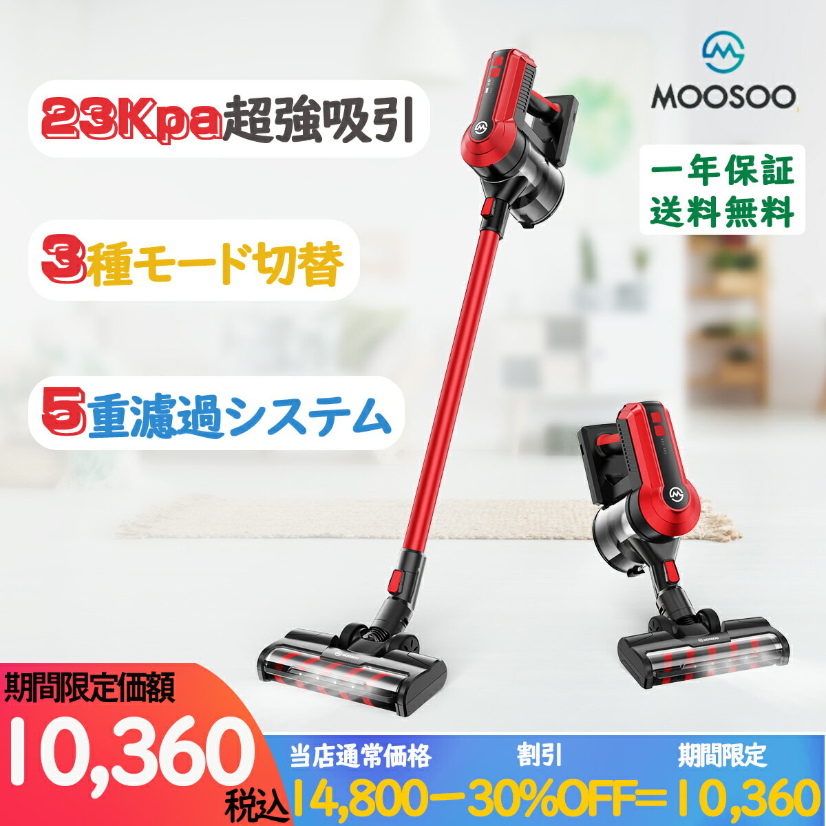 17.【期間限定30%OFFクーポン】掃除機 コードレス 23000pa 超強吸引力 サイクロン 3モード切替 5重濾過システム 35分間稼働 自走式ヘッド 1台4役 低騒音 人間工学デザイン 指示ライト 軽量 軽い コンパクト 充電式 サイクロン掃除機 ハンディ掃除機 スティック掃除機 MOOSOO K23