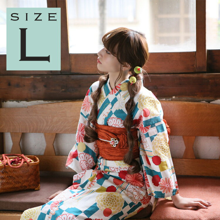 9.【70%OFF】浴衣 セット レディース 浴衣 3点セット(浴衣/帯/下駄)個性的 緑 赤 黄色 オレンジ モダン 市松 雪輪 縞 菊 ニコアンティーク 浴衣セット ゆかた 女性 レディース レトロ 大正ロマン 古典柄 モダン Lサイズ 大きいサイズ トールサイズ