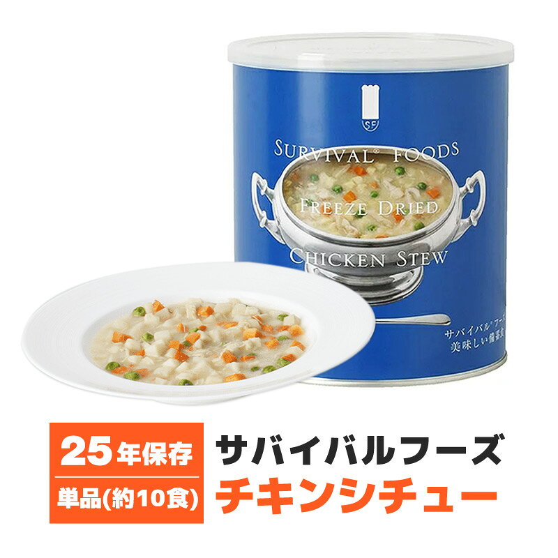 内容量 チキンシチュー(約422g 約10食分) 缶切付 湯または水の必要量 2.5L(1缶) メーカー品番 2653賞味期限25年のサバイバルフーズ・シリーズ「チキンシチュー」 国産じゃがいも、彩り野菜、しっとり柔らかな鶏肉、ホワイトルウが調和した、口の中でとろける甘くやさしいクリームシチュー。ほっとできるご家庭の味わいのシチューです。 国内製造なので安全・安心。自治体・省庁、病院や一般企業まで、様々な方面で採用されています。水・お湯なしで、そのままでも召し上がれます。