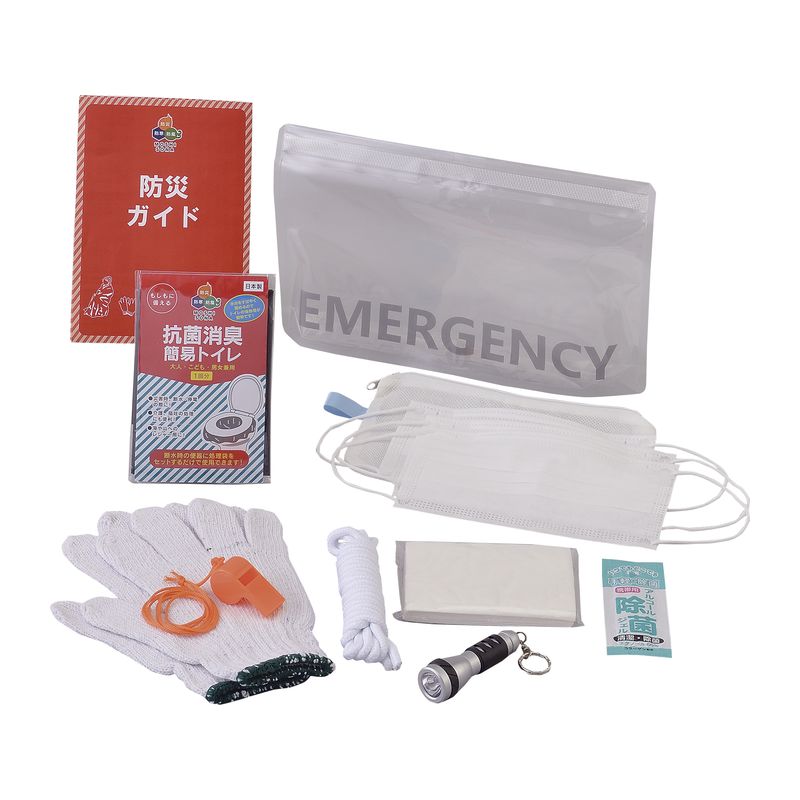 ■省スペースで保管ができるジッパーファイル入りの防災セット。 ■ジッパーは特殊形状で高齢者の方でも簡単に使用出来ます。 ■携帯用にも便利で、かばん、引き出し、車載など、すき間を利用してすぐに取り出せる場所に保管できます。 ■車のドアポケットやシートポケットなどに収納しておけます。 ■省スペースなので、すぐ取り出せる場所に保管できます。 【セット内容】 携帯用ポーチ:275×175×マチ50mm、ハンディライト(電池付)、抗菌消臭・簡易トイレ、軍手、ロープ3m、笛、ポケットティッシュ、除菌ジェル1.5mL、