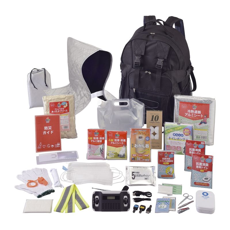 ■家族分を常備できる大容量リュック。■非常時に重宝するアイテムをセットにしました。 【サイズ】 570×160×390mm 【総重量】 約3kg 【内容】 大容量リュック:540×355×210mm、4層!防寒・防風アルミシート、4層!防寒・防風アルミ寝袋、冷熱遮断アルミシート、コンパクトあったかフリース、レスキュー簡易頭巾、多機能防災ラジオライト、抗菌消臭・簡易トイレ×2、抗菌消臭・トイレの凝固剤10個入、軍手、ロープ3m、笛、反射安全タスキ、しおり拡大鏡、防災ガイド、あんしんトイレポンチョ、非常用給水