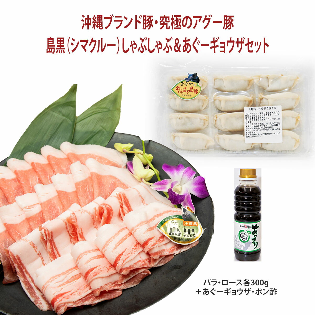 10.お中元【送料無料】フレッシュミートがなは 豚肉ギフト しゃぶしゃぶ 沖縄アグー豚 豚肉 我那覇畜産直送 高級豚肉 島黒(シマクルー)しゃぶしゃぶ+あぐーギョウザセット ロース・バラ各300g+あぐーギョウザ1P・ポン酢(計990g)ギフト 内祝い 沖縄ブランド豚 お取り寄せ
