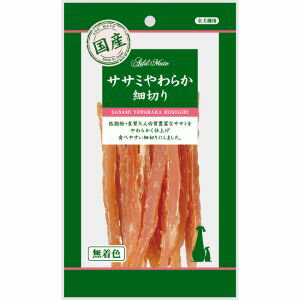 ・低脂肪・良質たん白質豊富なササミをやわらかく仕上げ、食べやすい細切りにしました。・小型犬・シニア犬にも食べやすいしっとりやわらか食感。・着色料不使用。【原材料】鶏ササミ、食塩、グリセリン、プロピレングリコール、発色剤(亜硝酸Na)、酸化防止剤(V.C)【保証成分】粗たん白質44.5%以上、粗脂肪0.5%以上、粗繊維0.1%以下、粗灰分3.5%以下、水分38.0%以下、ナトリウム0.2g以下【エネルギー】267kcal/100g【賞味期限(製造日から。メーカー保管期間含む)】1年【原産国または製造地】日本