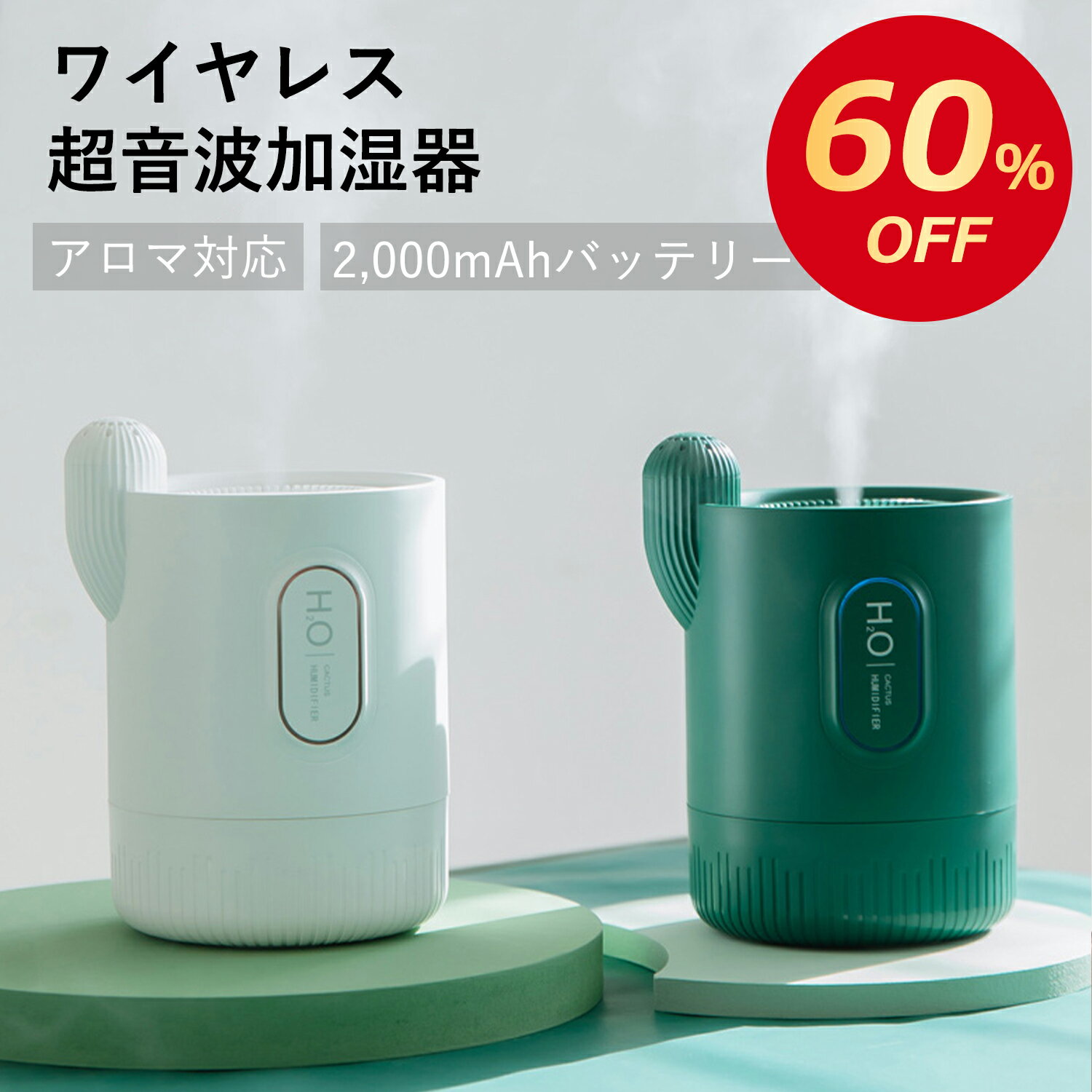 2.【60%OFF】【レビュー記入で30日保証】加湿器 ワイヤレス卓上LED加湿器 アロマディフューザー サボテン 小型加湿器 グリーン 静音 空焚き防止 容量330ML 韓国 かわいい おしゃれ