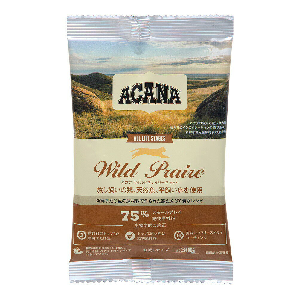 メーカー:アカナ食べて、健康で逞しく過ごすためのキャットフード!アカナ ワイルドプレイリーキャット 30g 正規品対象全猫種タイプドライフード機能総合栄養食ライフステージオールステージ特長●アカナワイルド・プレイリーは放し飼い鶏肉、七面鳥肉、全卵、天然魚をふんだんに使用しているキャットフードです。 ●毎日地元から新鮮あるいは生の状態で搬送、添加栄養素が少なく自然の栄養たっぷりです。 ●猫にとって不必要な炭水化物を抑えた本製品は炭水化物の他に地元産野菜、フルーツを贅沢に使用しています。 ●カナダ政府より人間