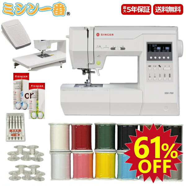 \SS期間は全商品ポイント10倍(エントリー要)最大78%OFF!割引クーポンも有/新型 豪華4点特典付! シンガー コンピュータミシン SSX-700 SSX700 FCとWT付き 押え圧調節 自動糸調子 自動糸切り ミシン初心者 コンピューターミシン 64,000円 送料無料 セール終了日 12/11 01:59 レビュー平均4.33(6件) [ミシン一番] | 78%OFF