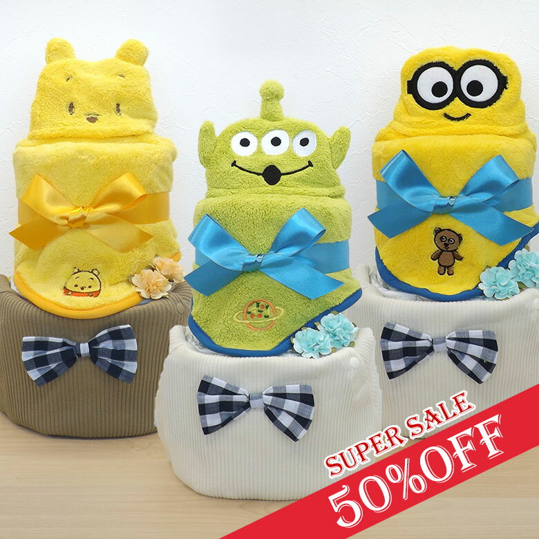 【楽天スーパーSALE 50%OFF】 おむつケーキ キャラクター 2段 紙おむつ マイクロループタオル ベビー服 出産祝い ポムポムプリン シナモロール マイメロディ プー エイリアン ミニオン