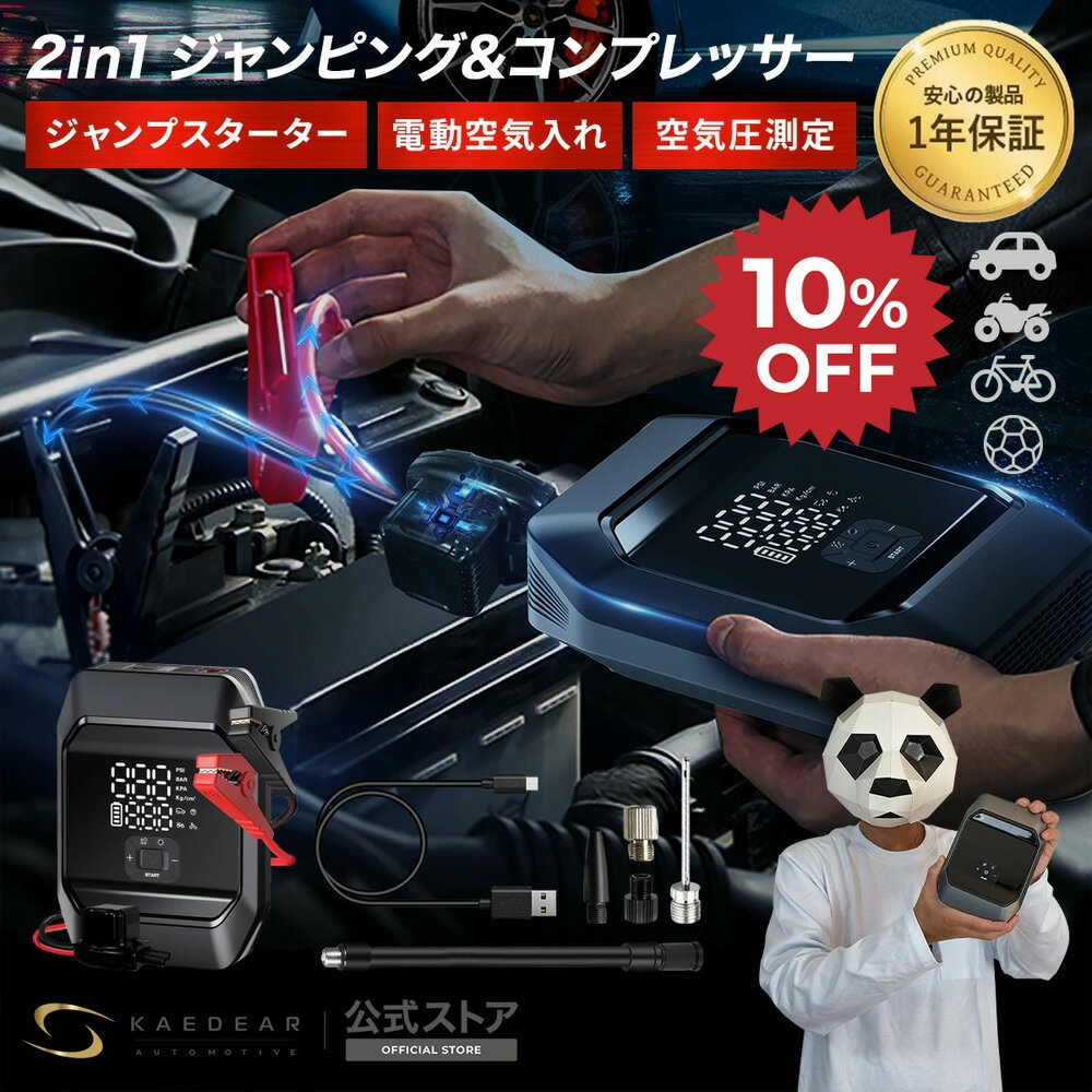 ★マラソン限定10%OFFクーポン★P2倍★ 【 車 ジャンプスターター & 電動空気入れ & モバイルバッテリー 】 LED搭載 エンジンスターター 車タイヤ空気入れ 電動空気入れ 車 バイク 自動車 ボール エアーコンプレッサー 車バッテリー上がり 車バッテリー充電 車空気入れ 12,980円 送料無料 レビュー平均4.32(71件) [株式会社 Kaedear] | 10%OFF