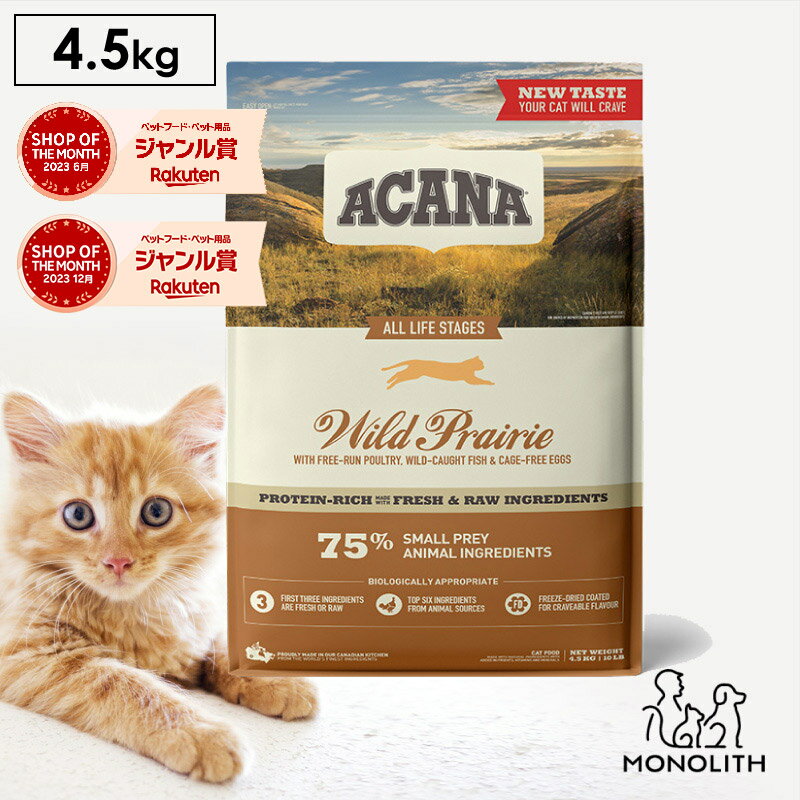 \25%OFF!11/20 20:00〜11/27 1:59/アカナ ワイルドプレイリーキャット 4.5kg 4.5キロ ACANA あす楽 キャットフード 猫 正規品 ドライ ドライフード 猫用 成猫 シニア 体重管理 肥満 全ライフステージ用 ペットフード カリカリ 無添加 13,035円 送料無料 セール終了日 11/27 01:59 レビュー平均5(1件) [人とペットのサプリ専門店モノリス] | 25%OFF