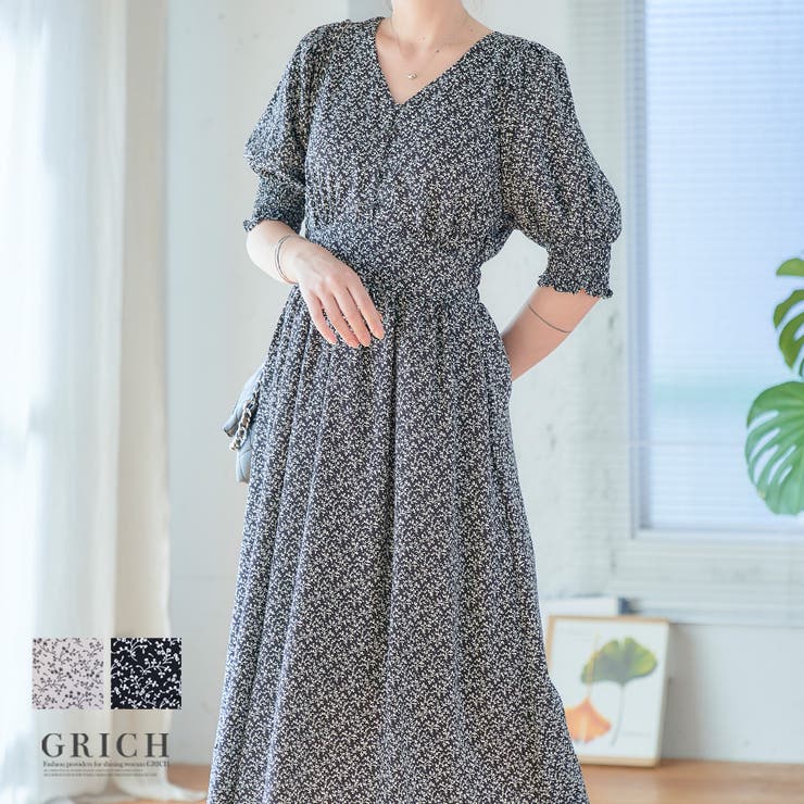 【10%OFFクーポン!11/27(木)1:59まで】Growing Rich パフスリーブ花柄ワンピース ワンピース ロング ひざ下 膝下 半袖 花柄 パフスリーブ ぽわん袖 Vネック ボリューム袖 ロングワンピ ウエストギャザー 上品 ブラック ホワ 4,671円 [SHOPLIST] | 10%OFF