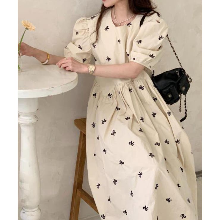 【今だけ全品最大30%OFF&最大2,000円クーポン配布】ワンピース パイピング スクエア襟 花柄 パフスリーブ 半袖 フレア レディース 夏 夏物 エレガント クラシカル きれいめ 着痩せー 優雅 立体感 お洒落 上品 アイボリー M/L/XL/2XL/3XL/4XL 5,980円 送料無料 [juju japan] | 30%OFF